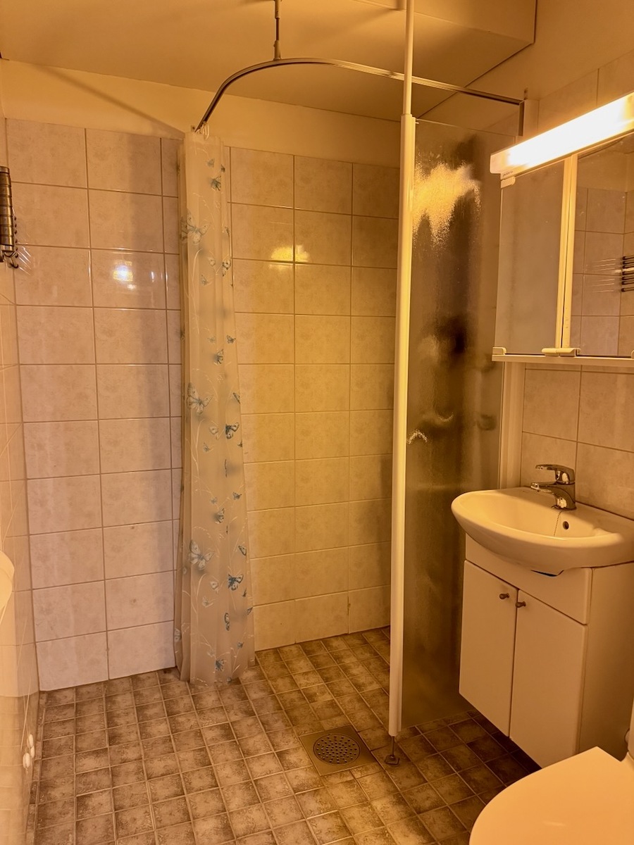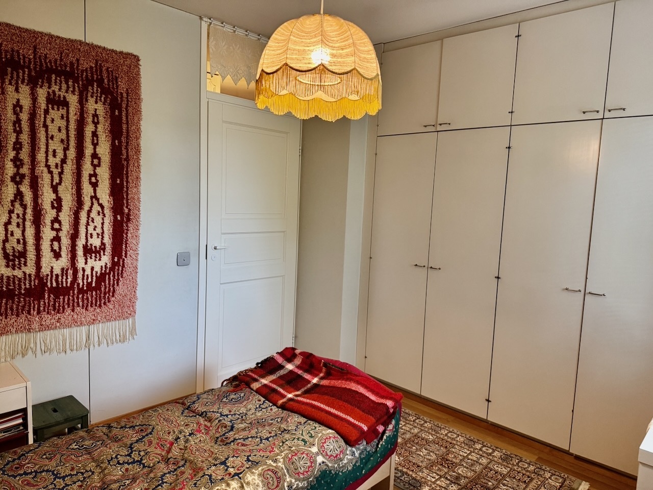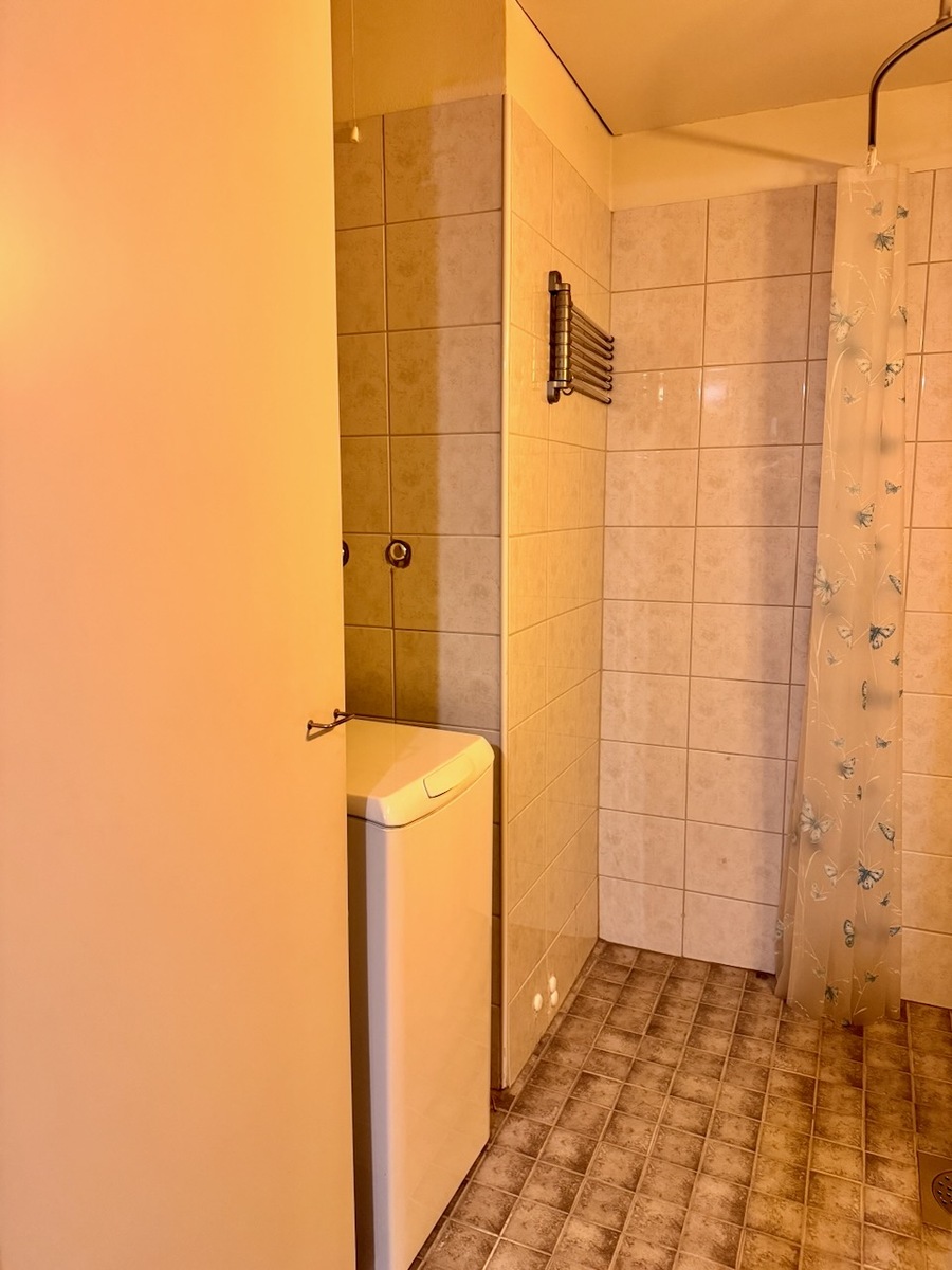Makuuhuoneesta löytyy kaappitilaa koko seinän leveydeltä. Keittiöön mahtuu hyvin ruokapöytä. Kaakeloidussa kylpyhuoneessa on tilaa omalle pesukoneelle.