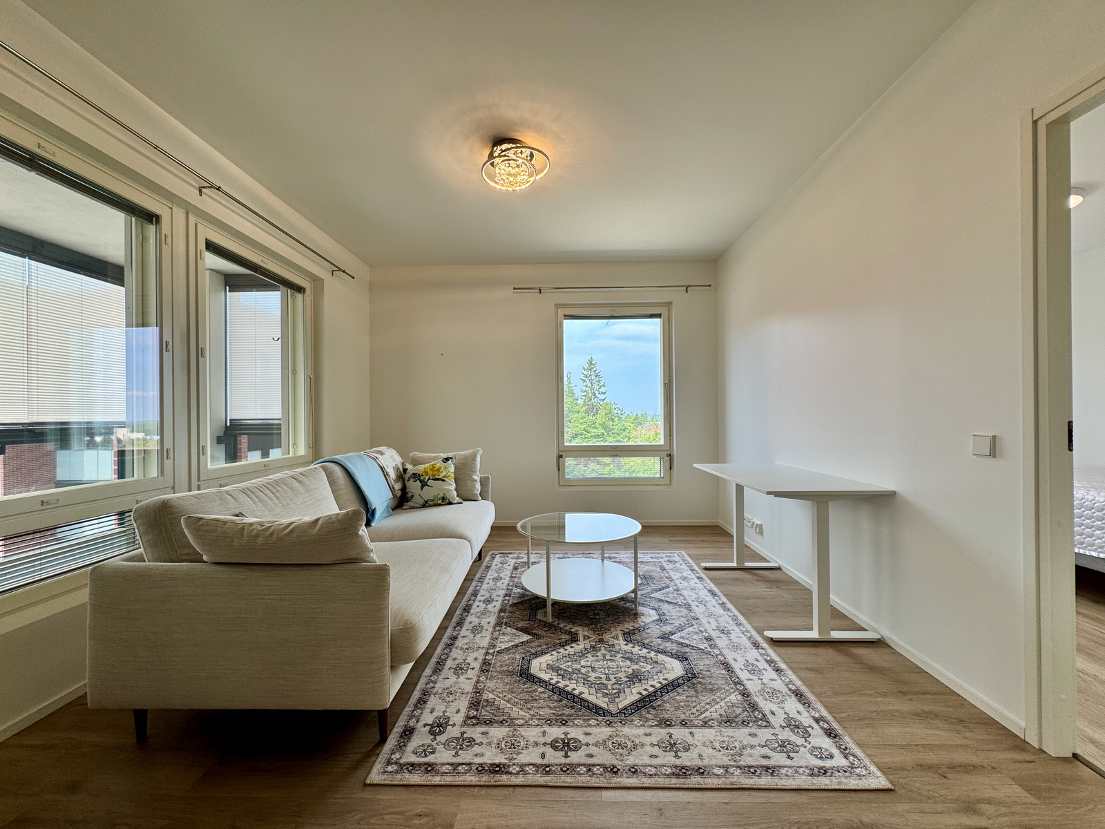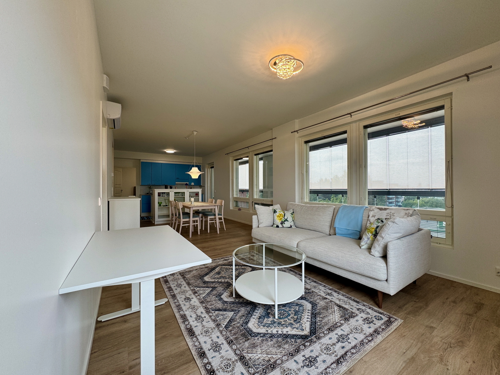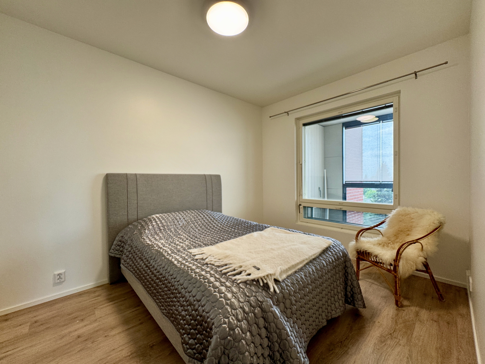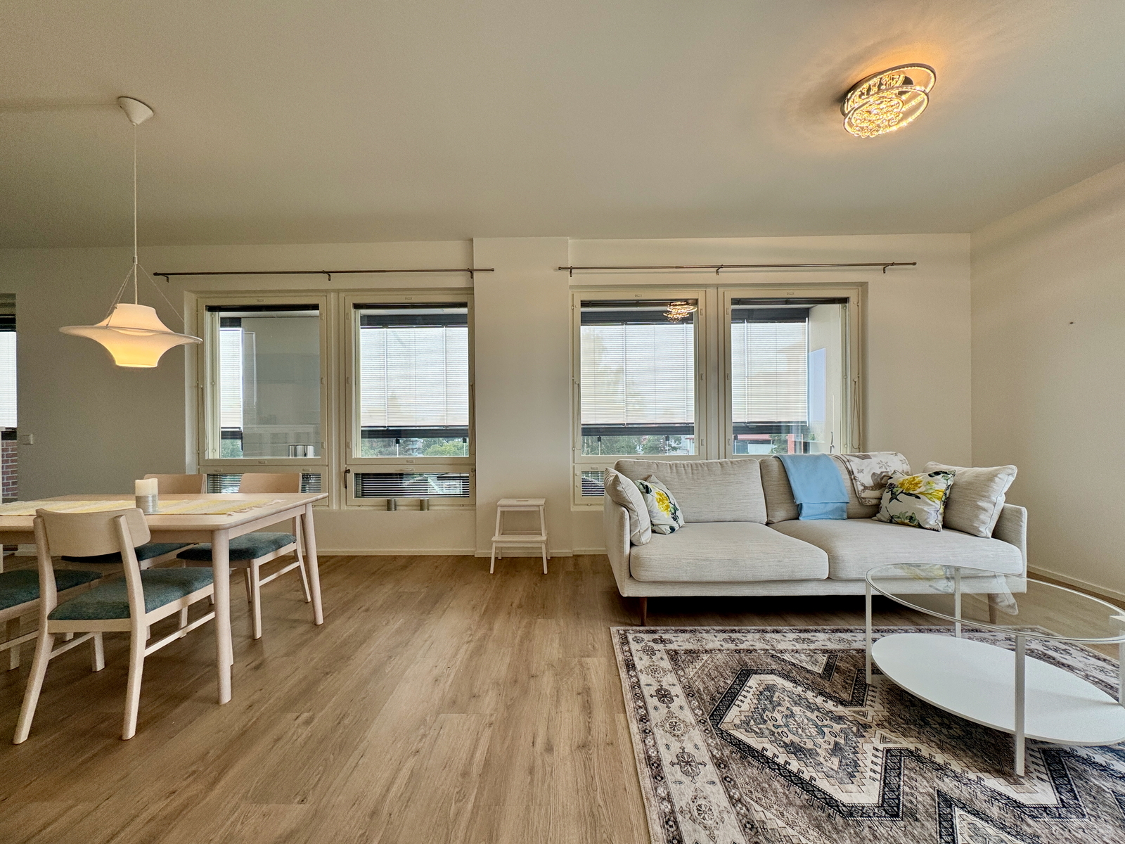 Lattiat ovat kestävää vinyyliä ja seinäpinnat on maalattu. Pohjaratkaisu on toimiva: makuuhuoneet sijoittuvat huoneiston eri puolille, ja keittiö yhdistyy avarasti olohuoneeseen muodostaen yhtenäisen, valoisan oleskelutilan.