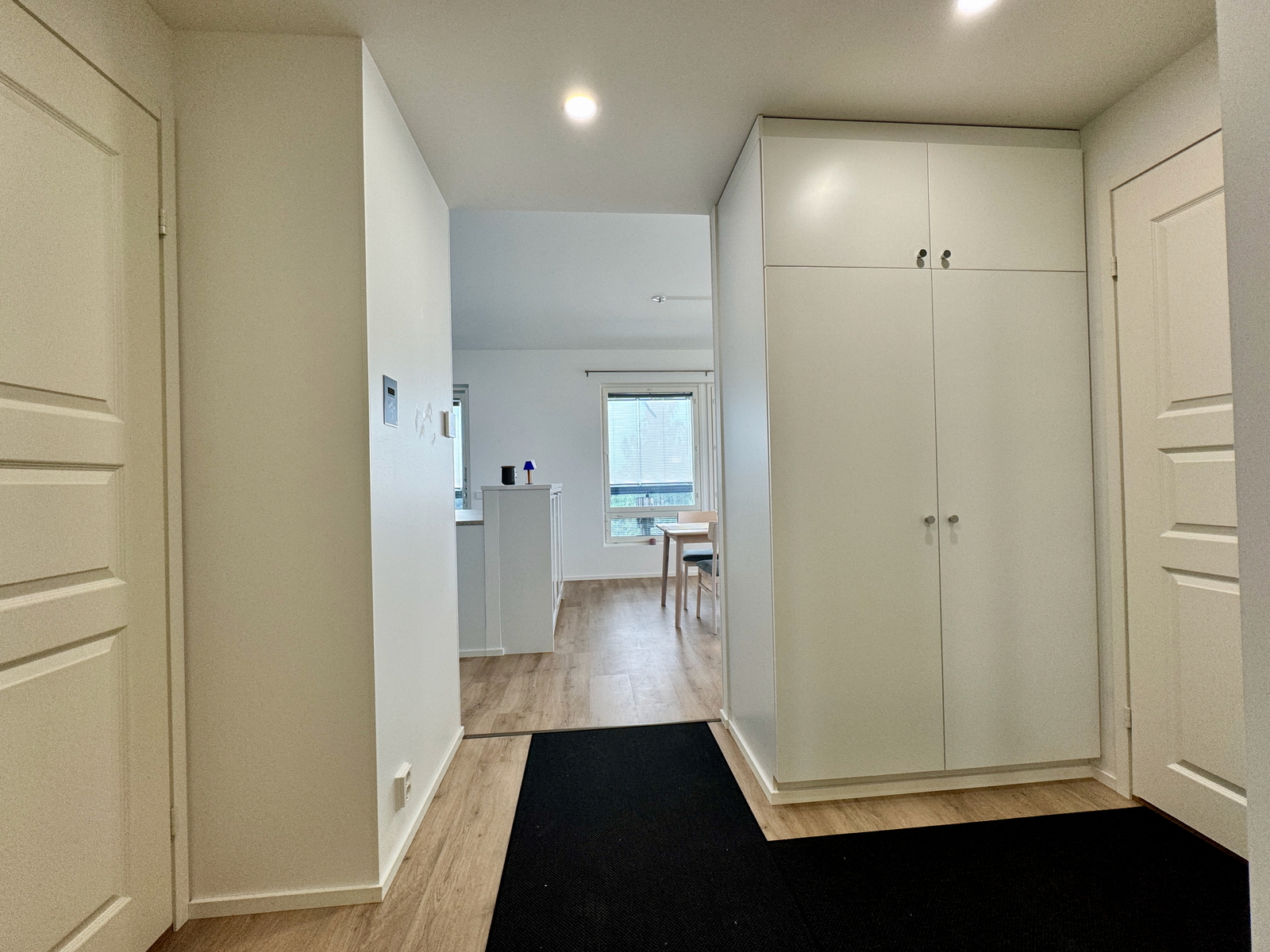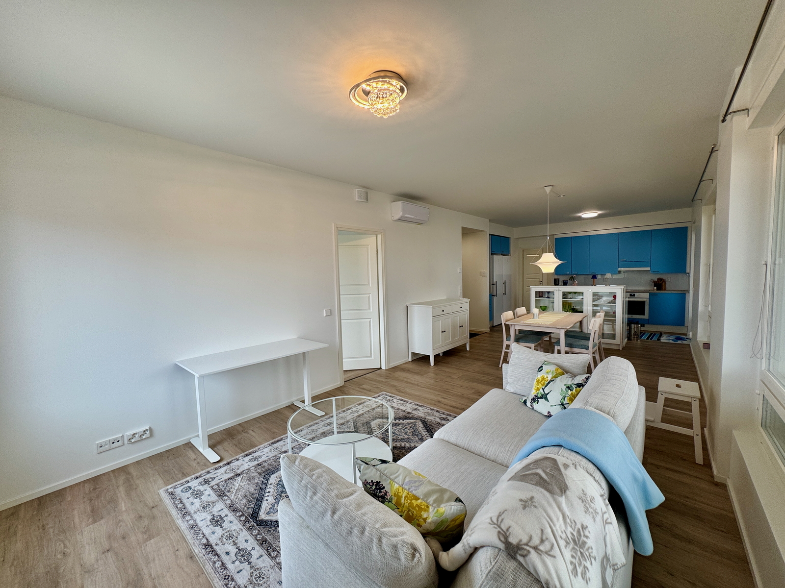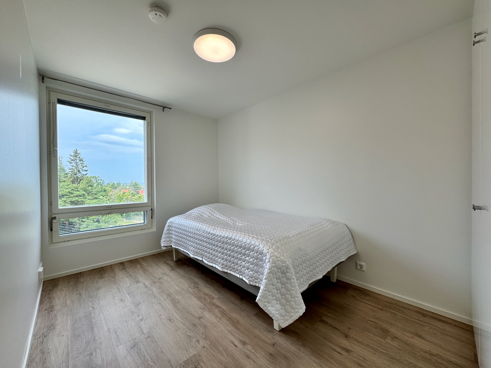 Lattiat ovat kestävää vinyyliä ja seinäpinnat on maalattu. Pohjaratkaisu on toimiva: makuuhuoneet sijoittuvat huoneiston eri puolille, ja keittiö yhdistyy avarasti olohuoneeseen muodostaen yhtenäisen, valoisan oleskelutilan.