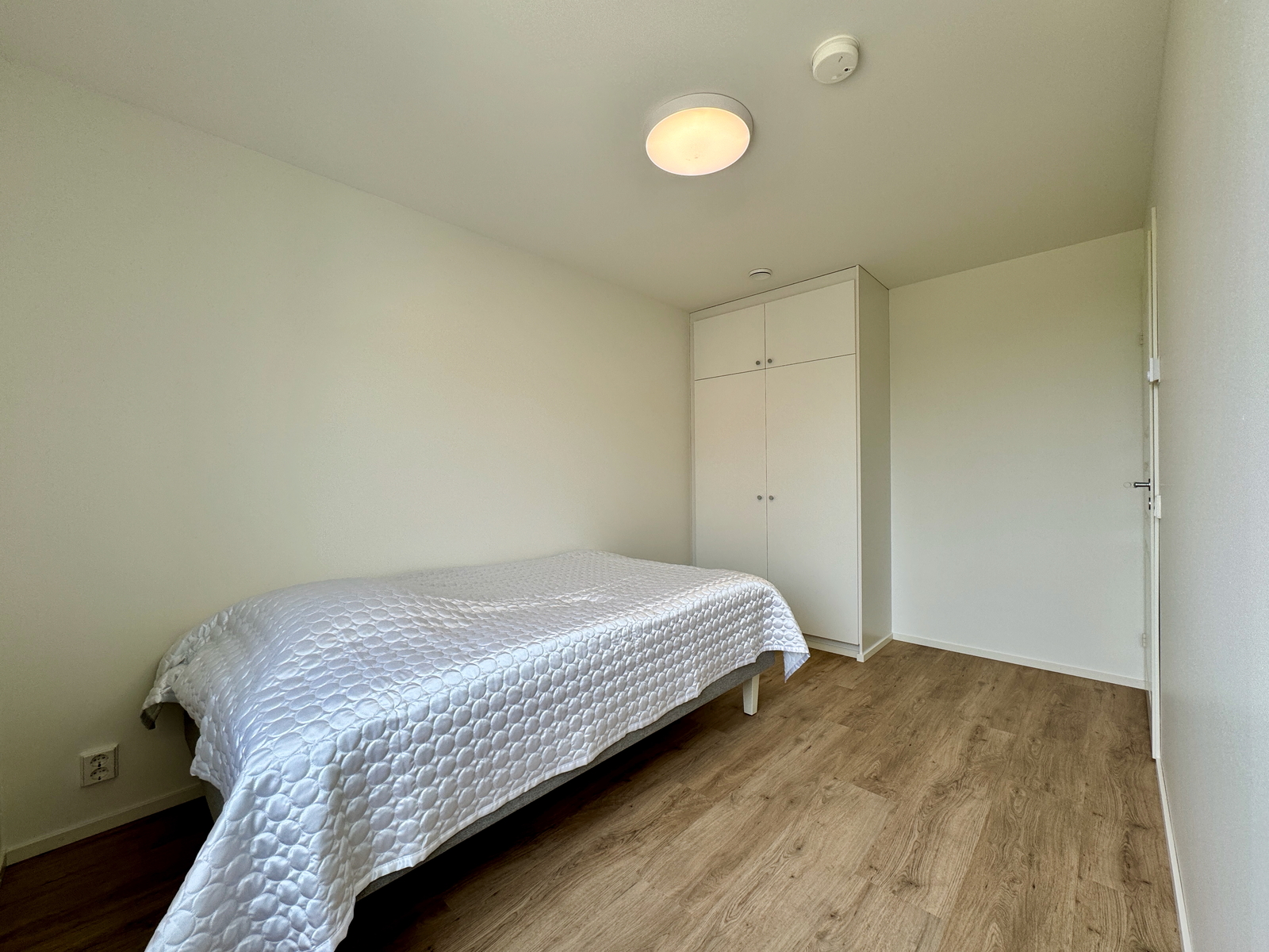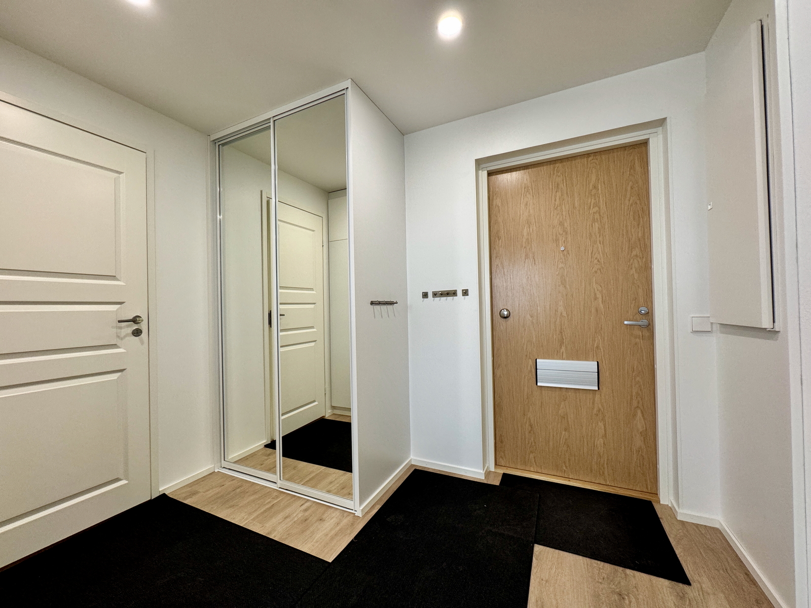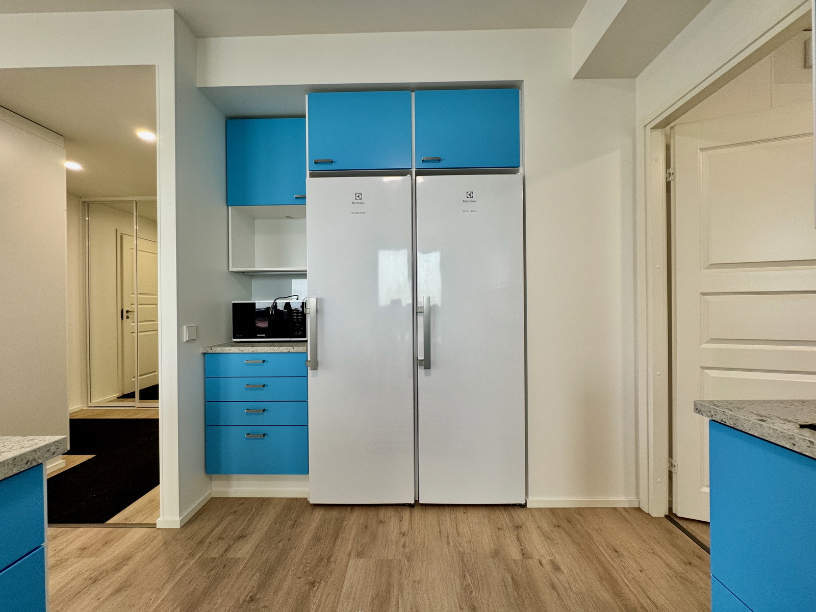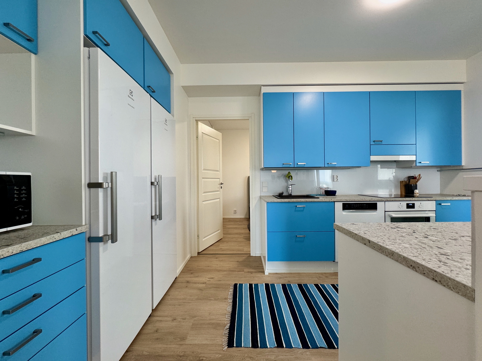 Lattiat ovat kestävää vinyyliä ja seinäpinnat on maalattu. Pohjaratkaisu on toimiva: makuuhuoneet sijoittuvat huoneiston eri puolille, ja keittiö yhdistyy avarasti olohuoneeseen muodostaen yhtenäisen, valoisan oleskelutilan.
