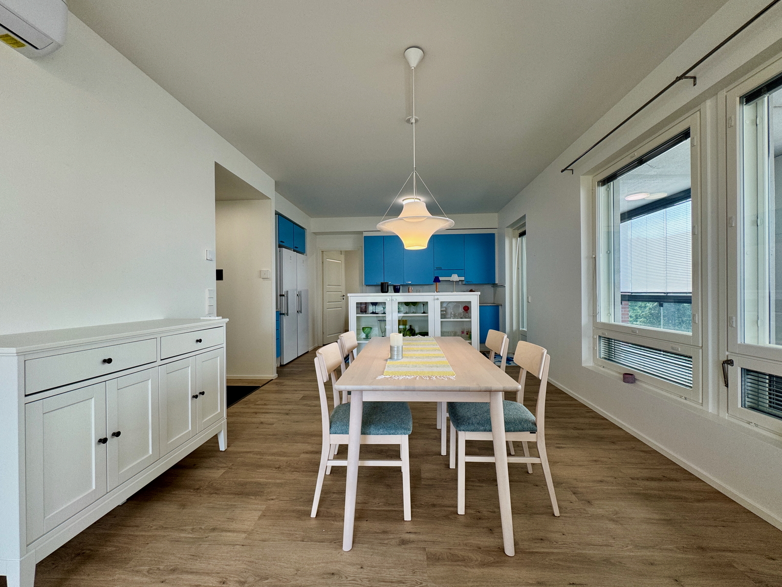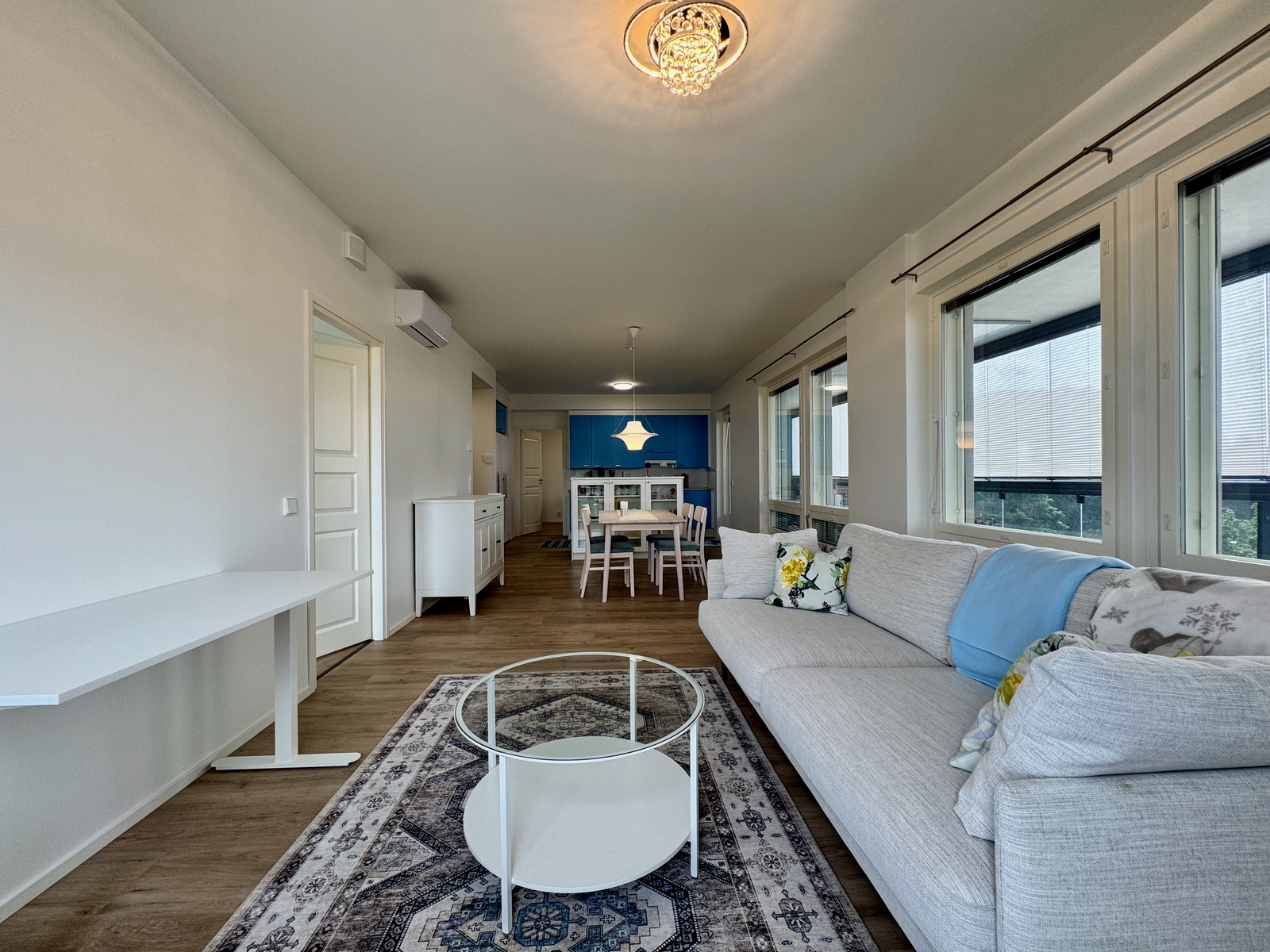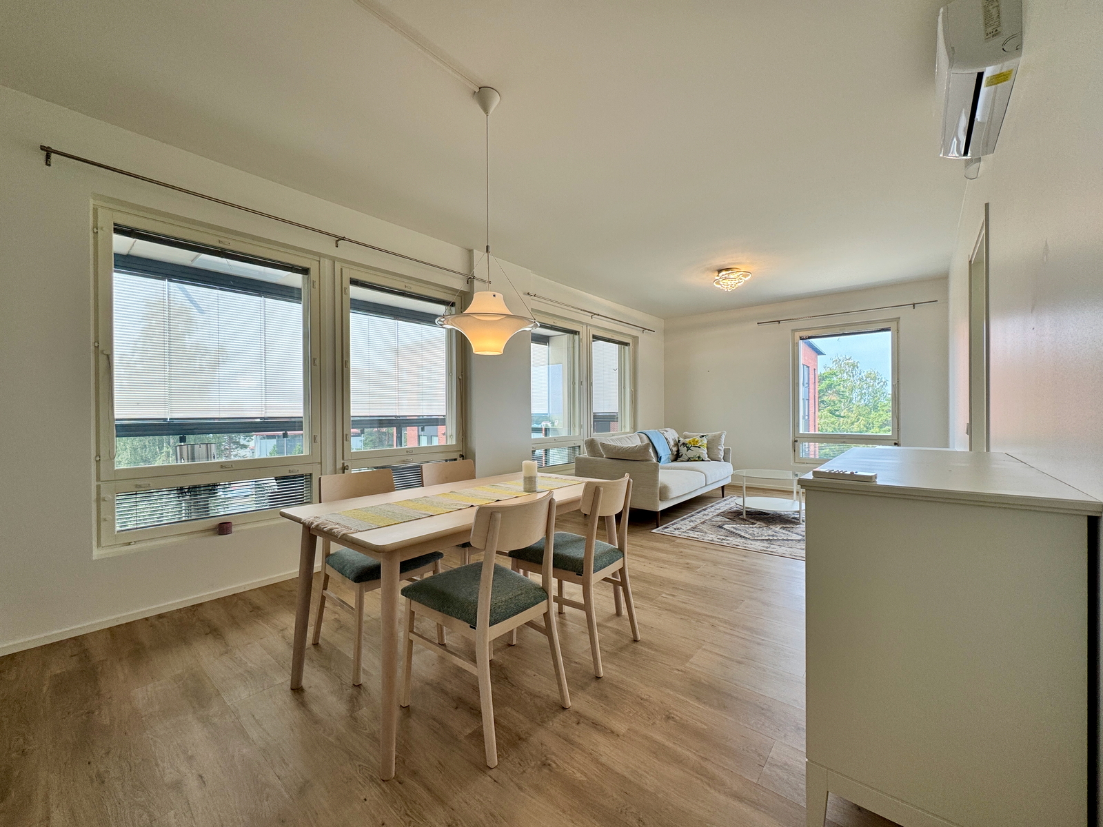 Huoneiston levyinen lasitettu parveke on varustettu ylälaseihin asennetuilla kaihtimilla, ja se tarjoaa mukavan lisätilan aikaisesta keväästä myöhäiseen syksyyn. Kesähelteillä asumismukavuutta lisää asennettu ilmalämpöpumppu, jolla voi viilentää huoneilmaa tarpeen mukaan.