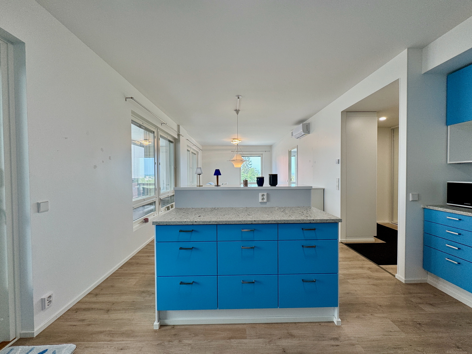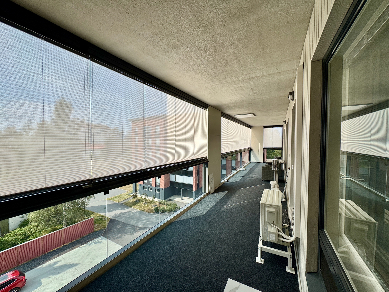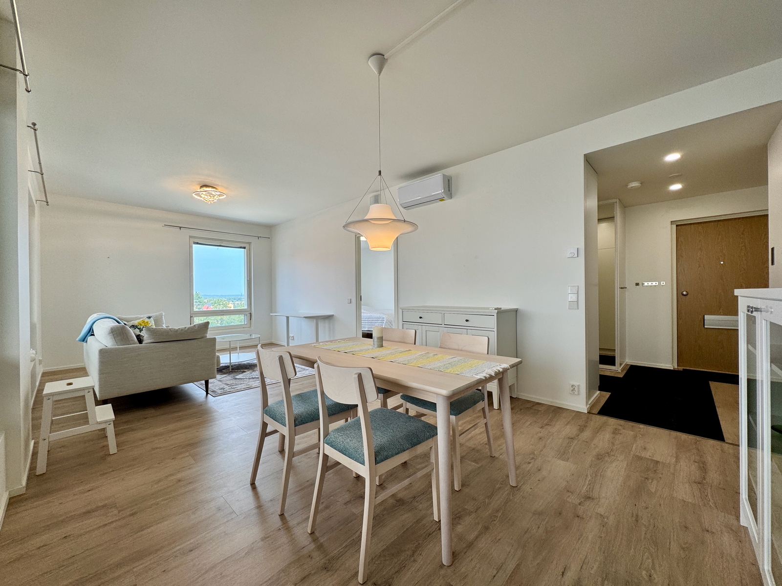 Huoneiston levyinen lasitettu parveke on varustettu ylälaseihin asennetuilla kaihtimilla, ja se tarjoaa mukavan lisätilan aikaisesta keväästä myöhäiseen syksyyn. Kesähelteillä asumismukavuutta lisää asennettu ilmalämpöpumppu, jolla voi viilentää huoneilmaa tarpeen mukaan.