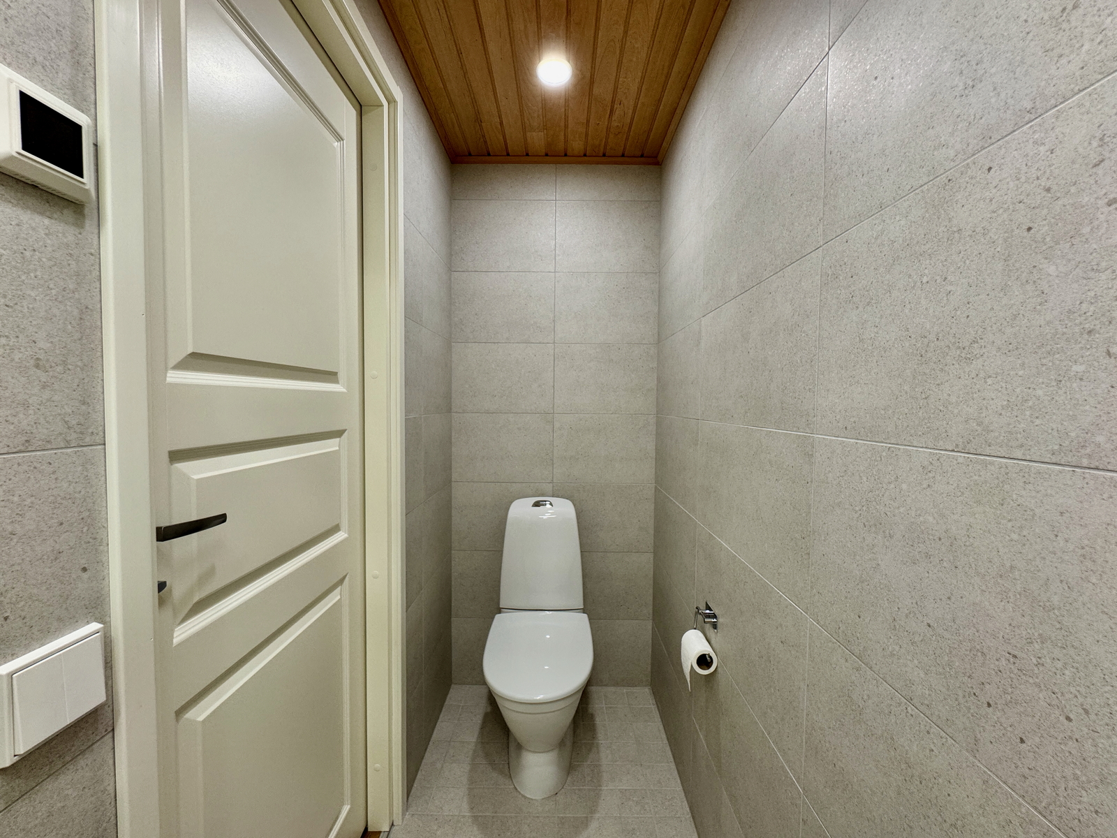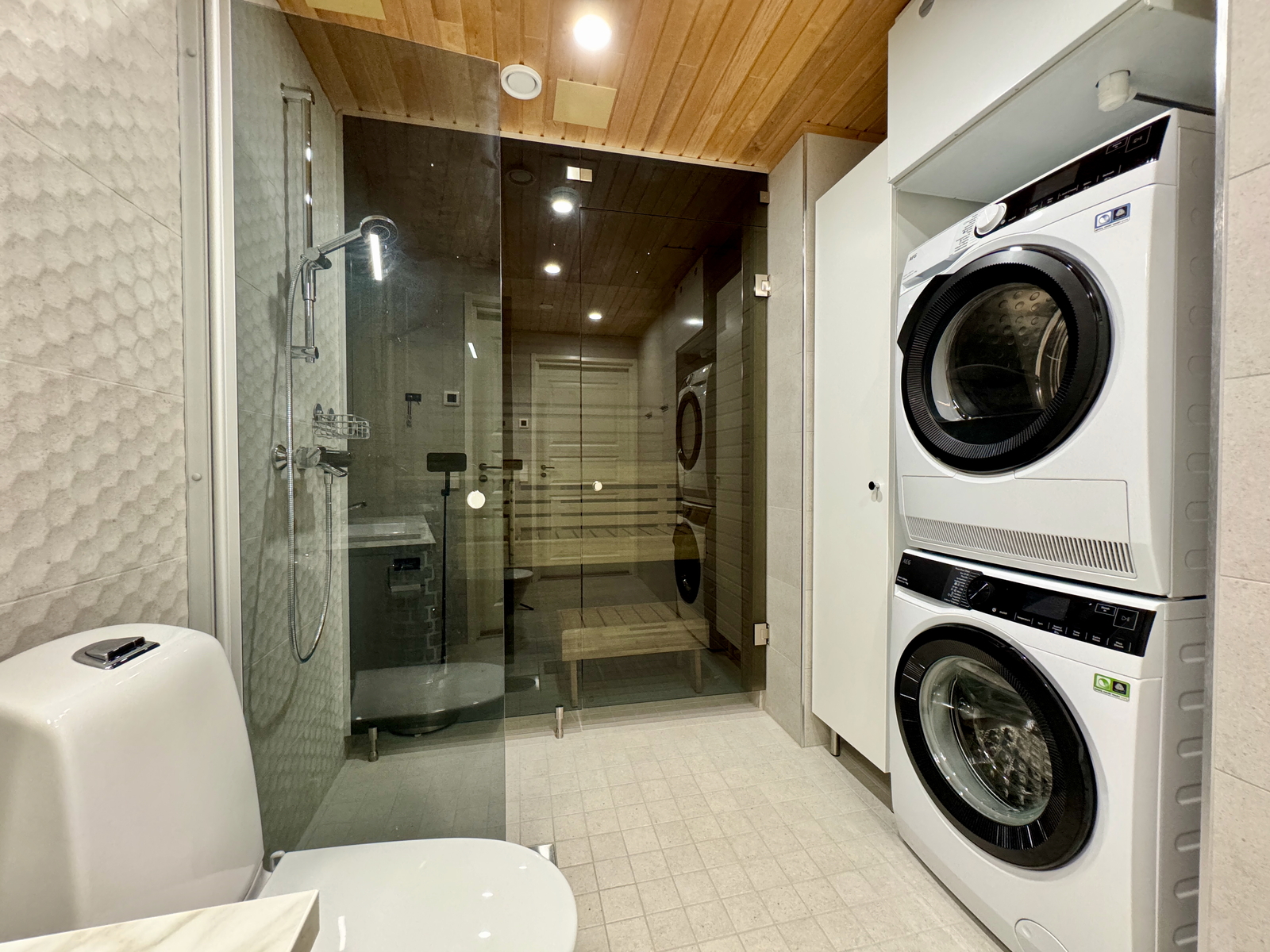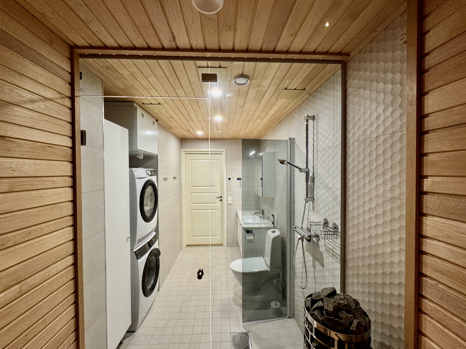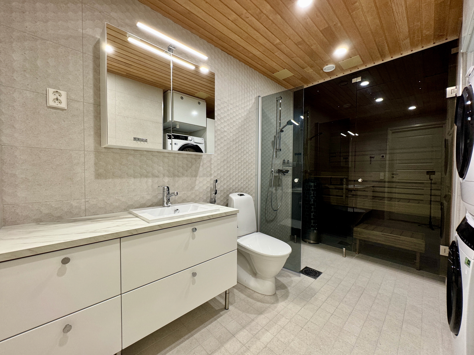 Tyylikkäästi kaakeloidussa kylpyhuoneessa on varustuksena mm. WC-istuin, lattialämmitys ja suihkuseinä. Saunan ja kylpyhuoneen välinen lasiseinä tuo tilaan avaruutta. Lisäksi asunnossa on erillinen WC arjen sujuvuuden lisäämiseksi.