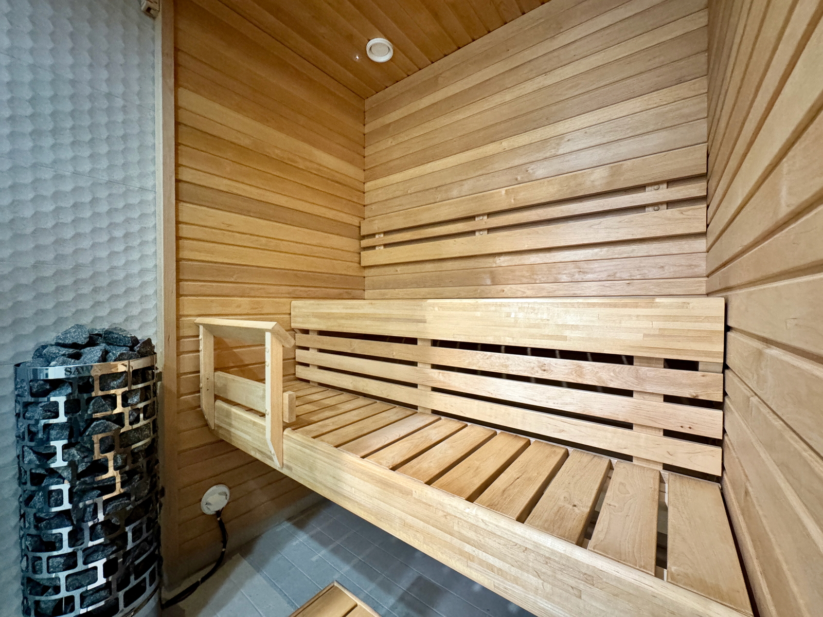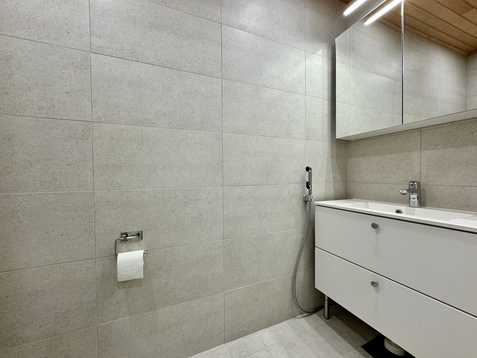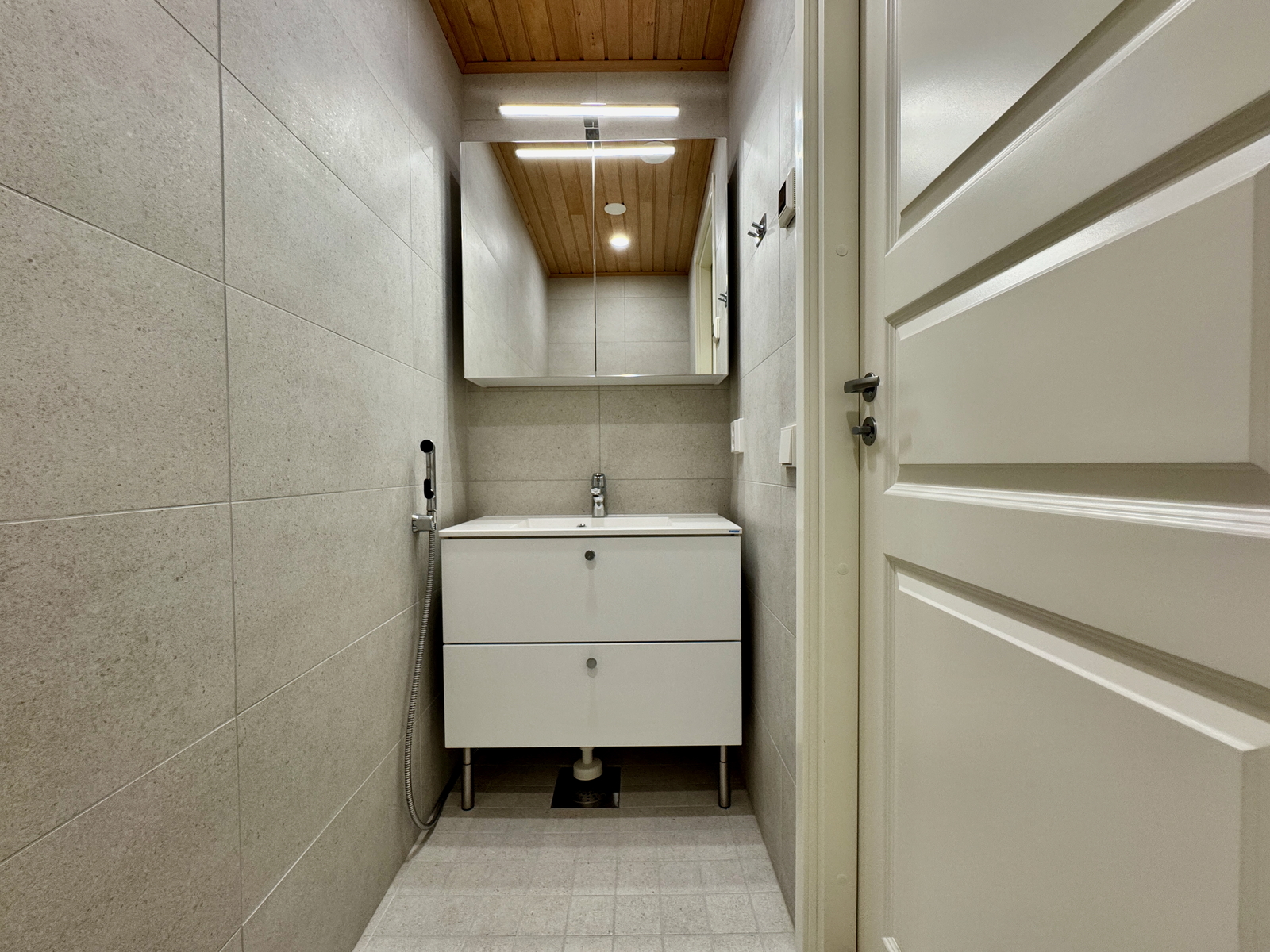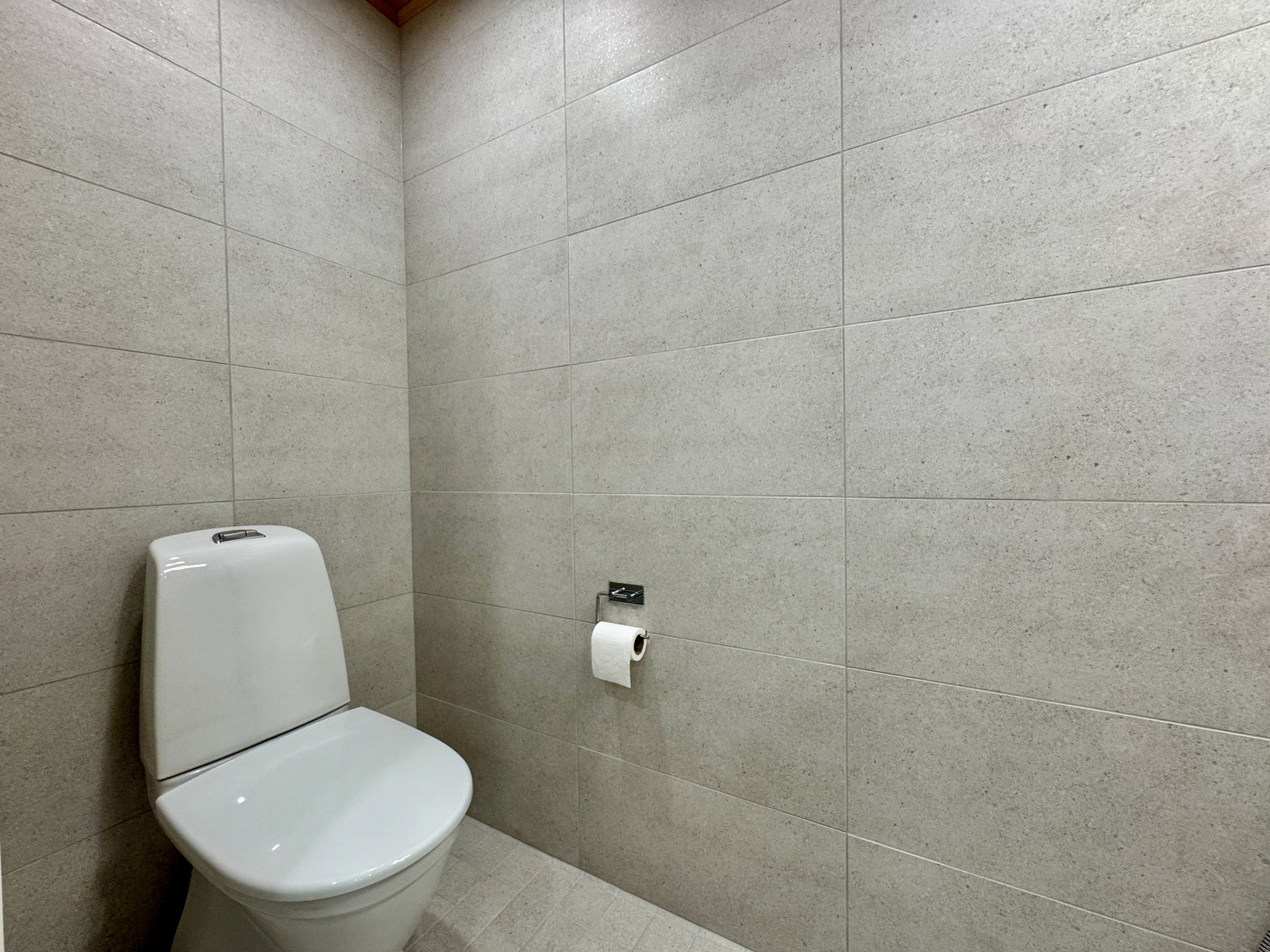 Tyylikkäästi kaakeloidussa kylpyhuoneessa on varustuksena mm. WC-istuin, lattialämmitys ja suihkuseinä. Saunan ja kylpyhuoneen välinen lasiseinä tuo tilaan avaruutta. Lisäksi asunnossa on erillinen WC arjen sujuvuuden lisäämiseksi.