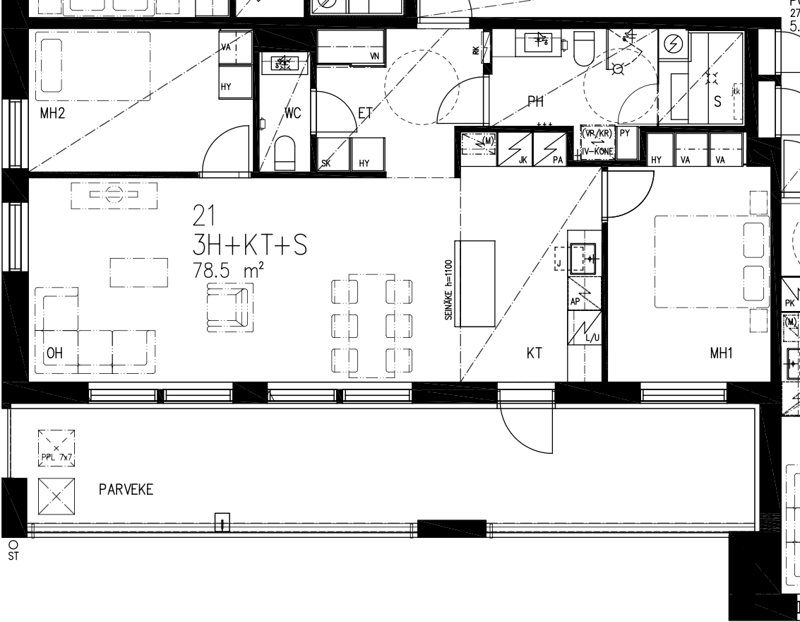 Tilava ja valoisa kolmio hissitalon viidennessä kerroksessa Niinivaaralla