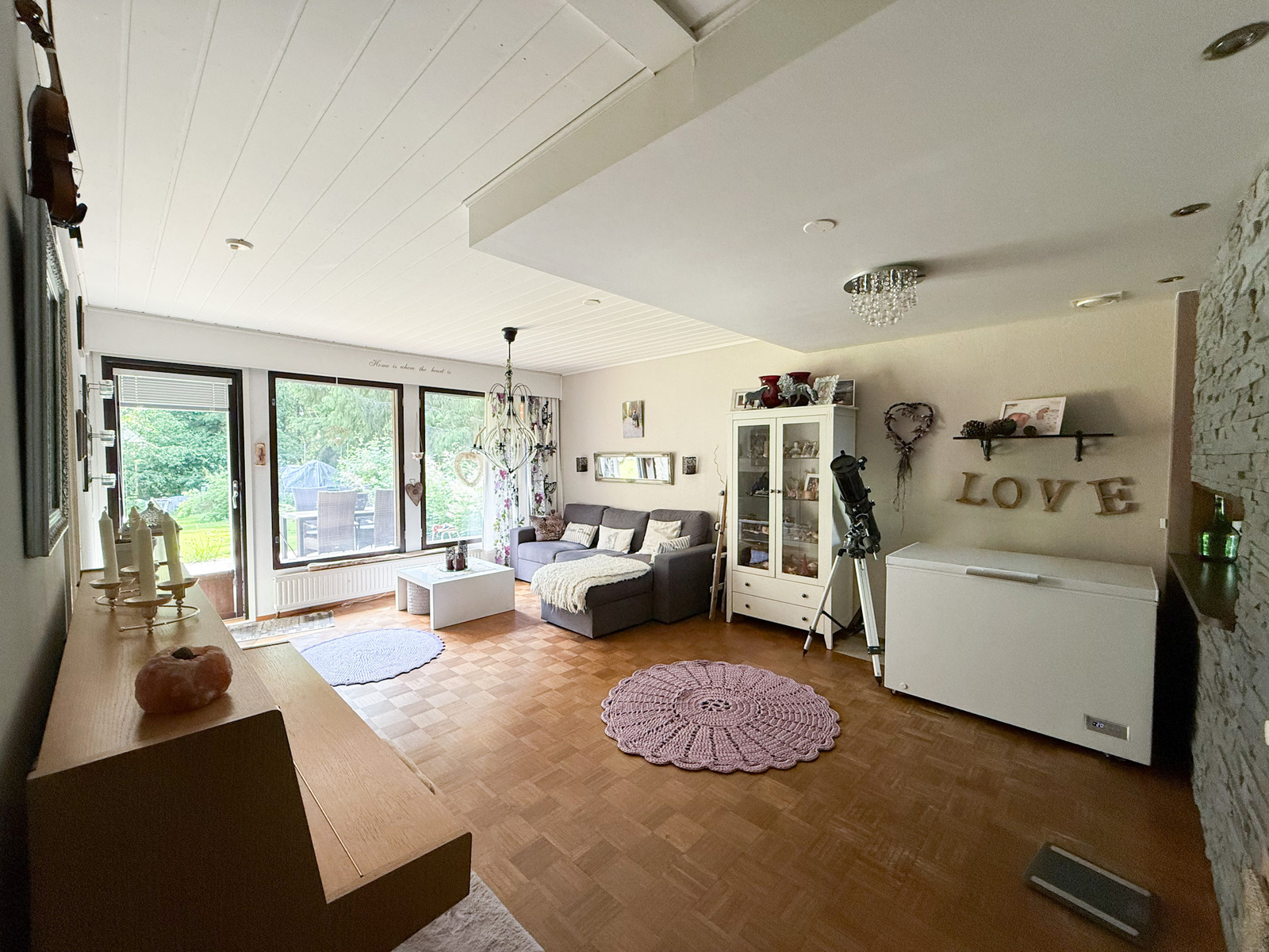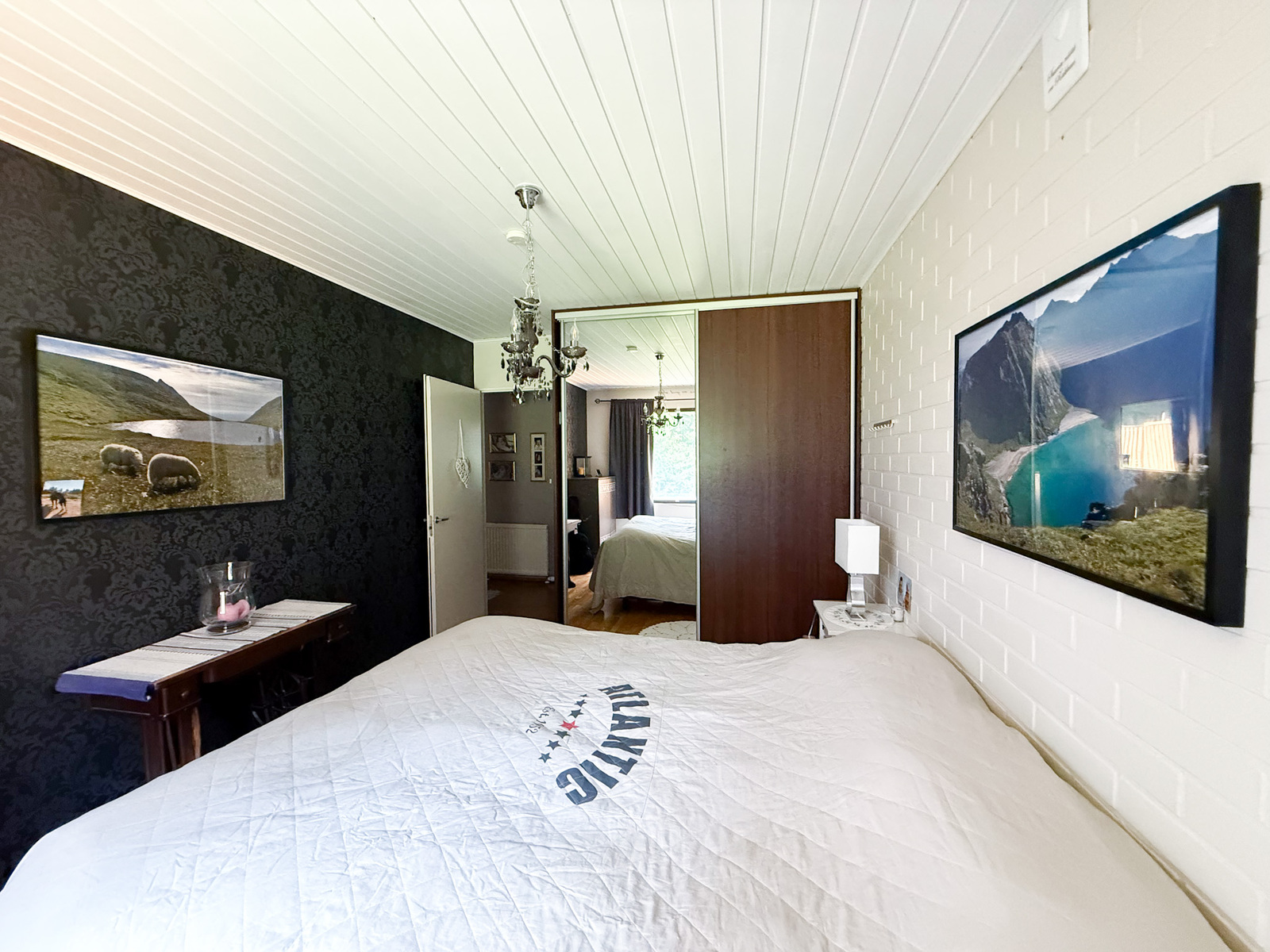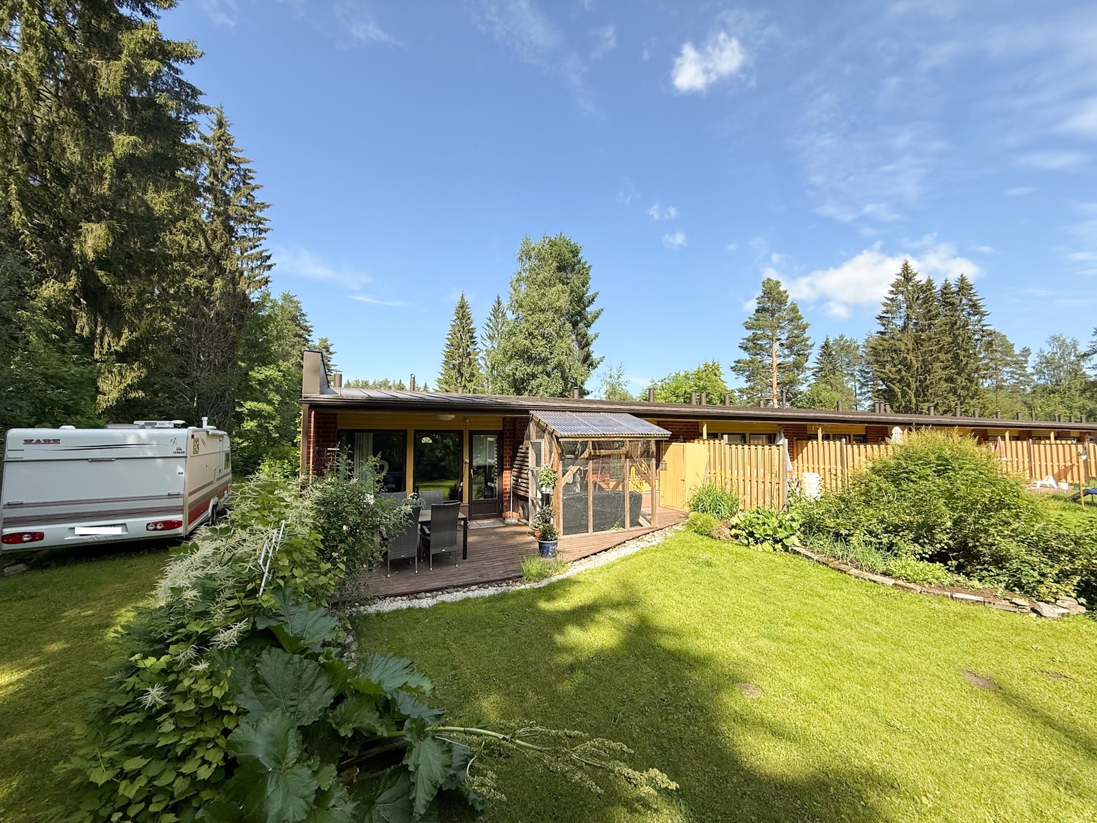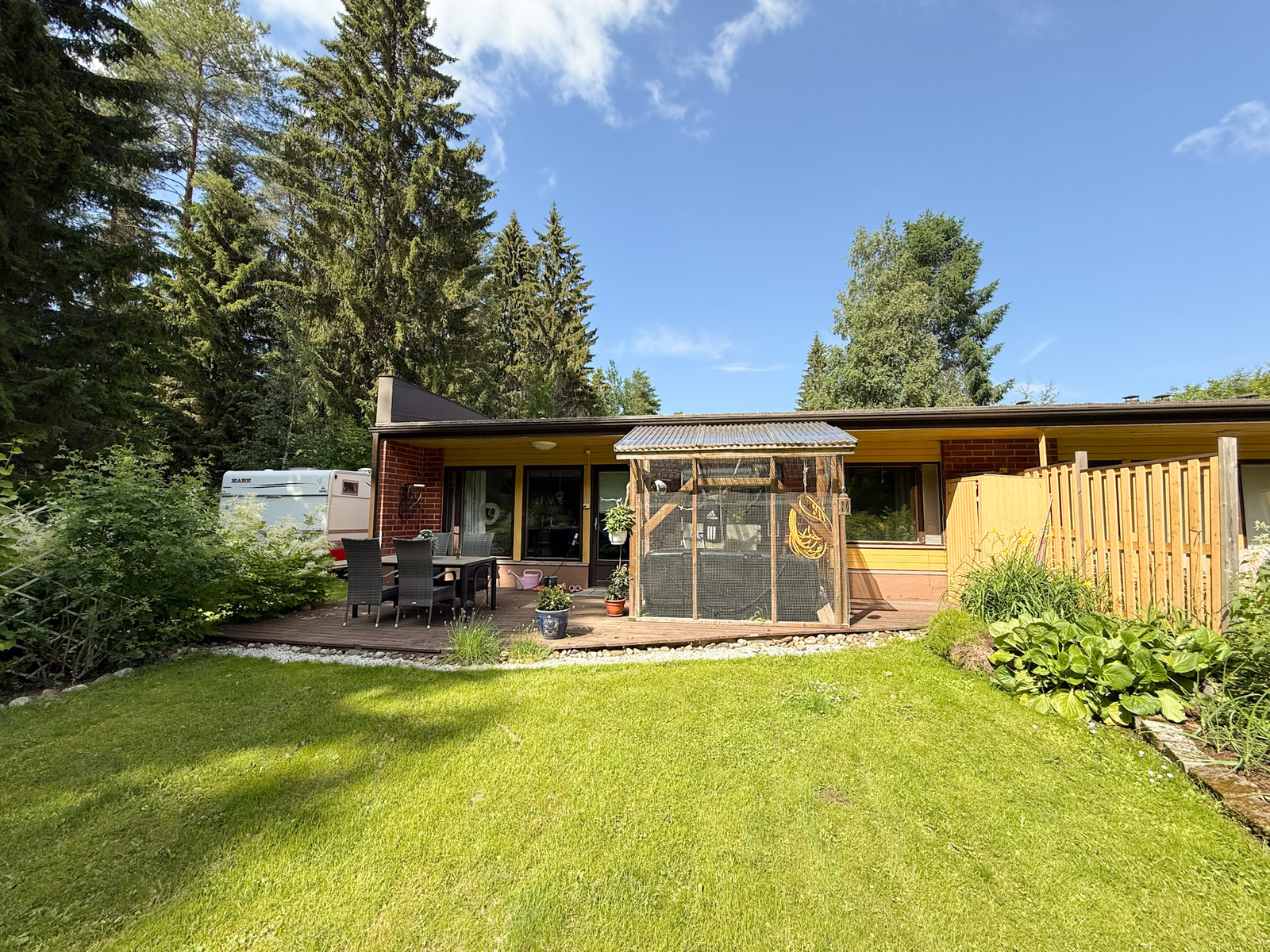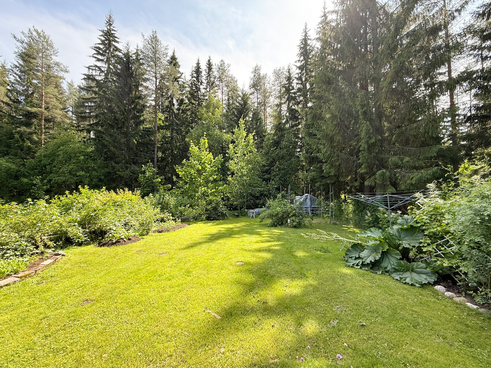 Erityisen viehättävä yksityiskohta on tilava ja vehreä takapiha, josta avautuu puistomainen näkymä täydellinen paikka kesäpäivien viettoon.