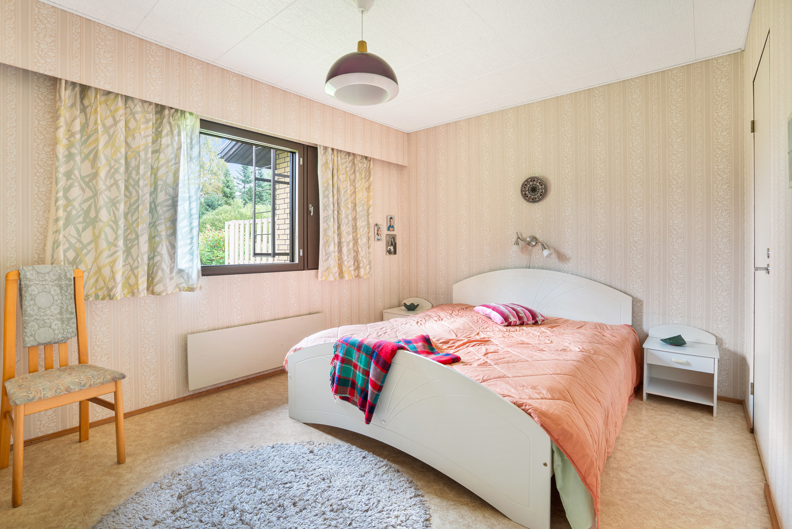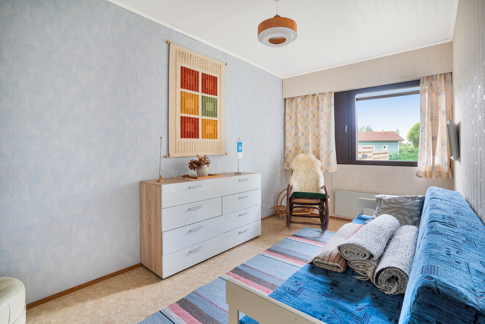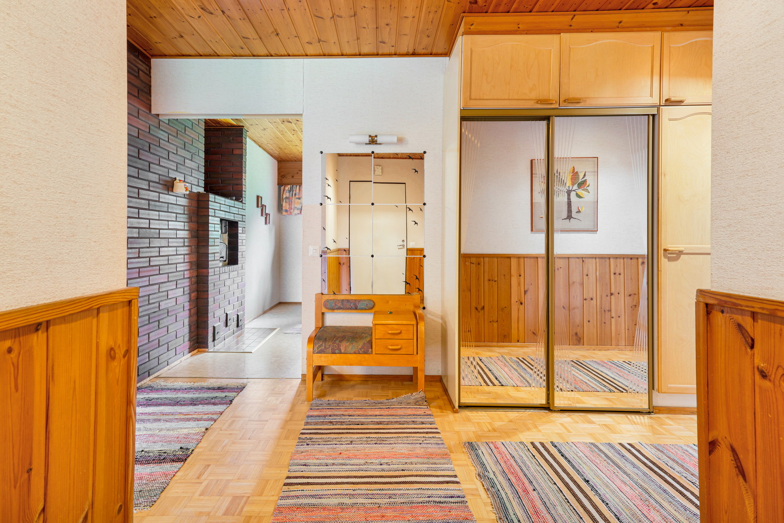 Huoneisto tarjoaa toimivan pohjaratkaisun: sisääntulon yhteydessä avautuu tilava eteinen. Eteisen käytävän varrelta löytyvät kolme makuuhuonetta sekä erillinen wc. Kahden makuuhuoneen välissä on kätevä läpikuljettava vaatehuone. Keittiö on erillisenä tilana ja sinne mahtuu hyvin ruokailuryhmä tunnelmaa luo lisäksi leivinuuni.