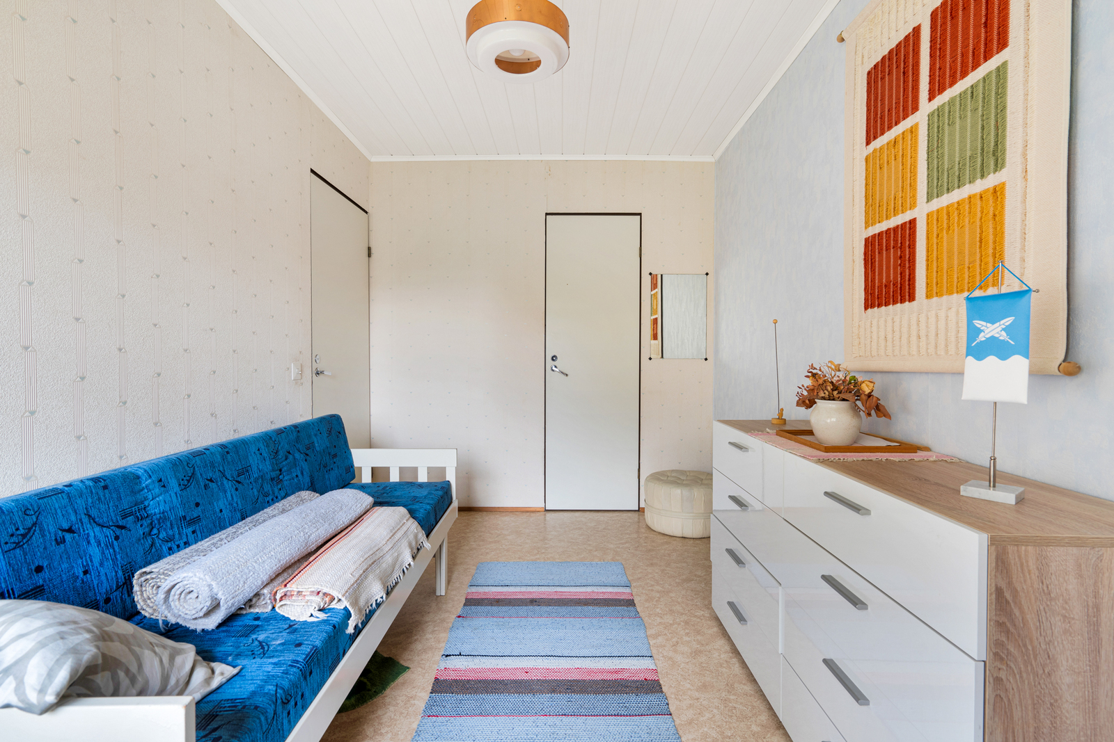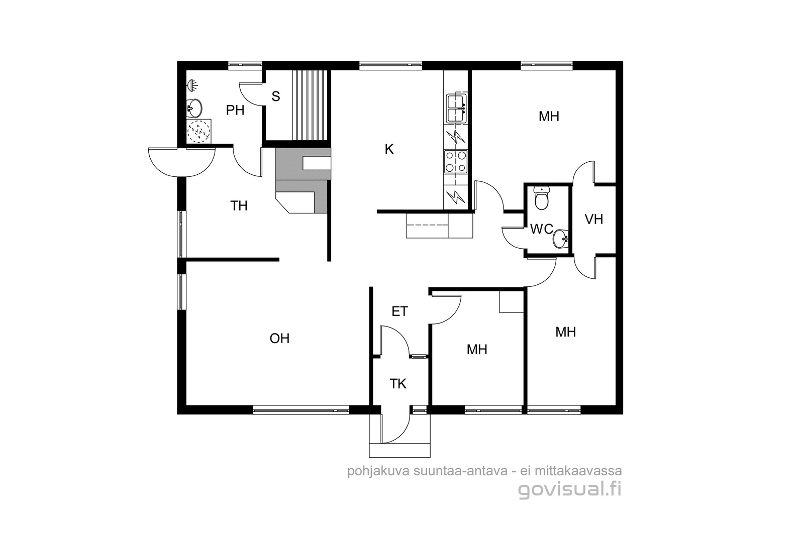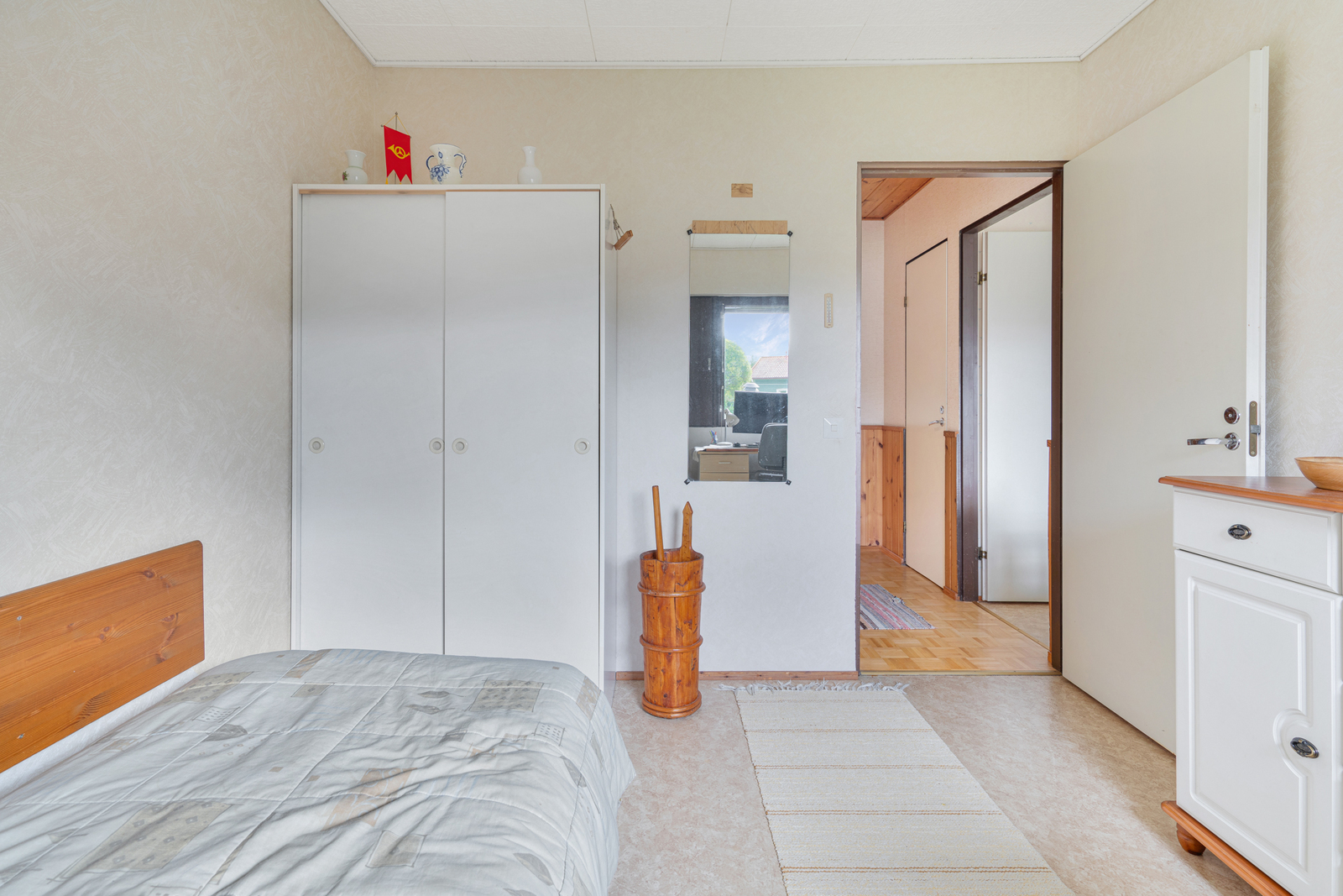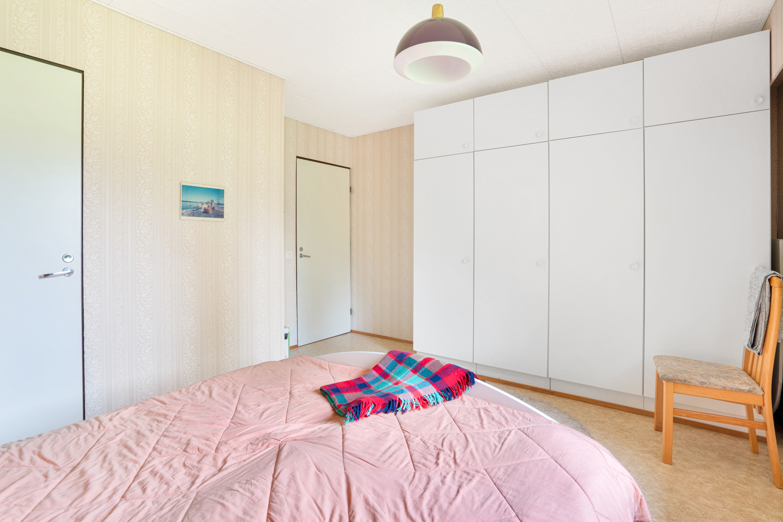 Huoneisto tarjoaa toimivan pohjaratkaisun: sisääntulon yhteydessä avautuu tilava eteinen. Eteisen käytävän varrelta löytyvät kolme makuuhuonetta sekä erillinen wc. Kahden makuuhuoneen välissä on kätevä läpikuljettava vaatehuone. Keittiö on erillisenä tilana ja sinne mahtuu hyvin ruokailuryhmä tunnelmaa luo lisäksi leivinuuni.