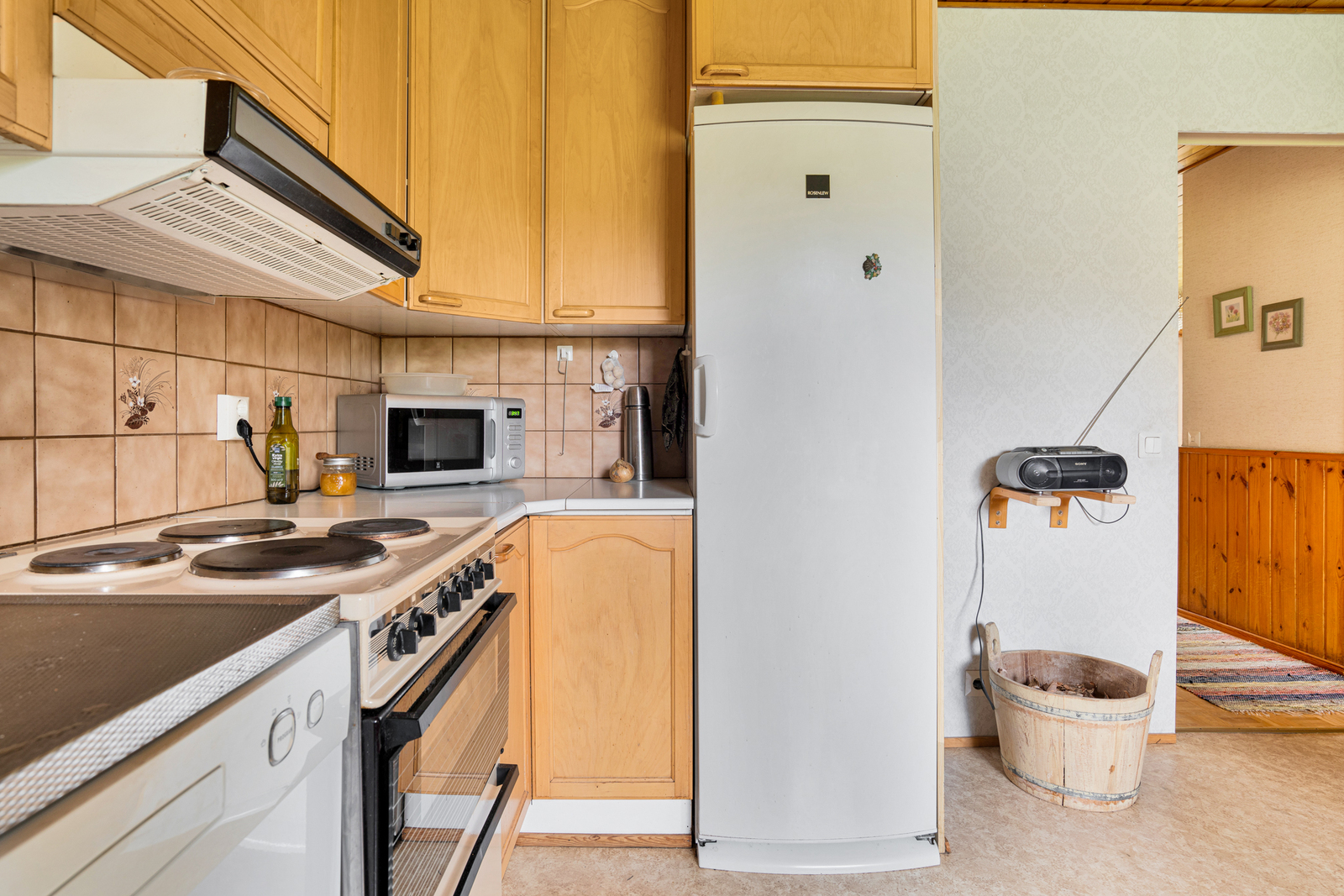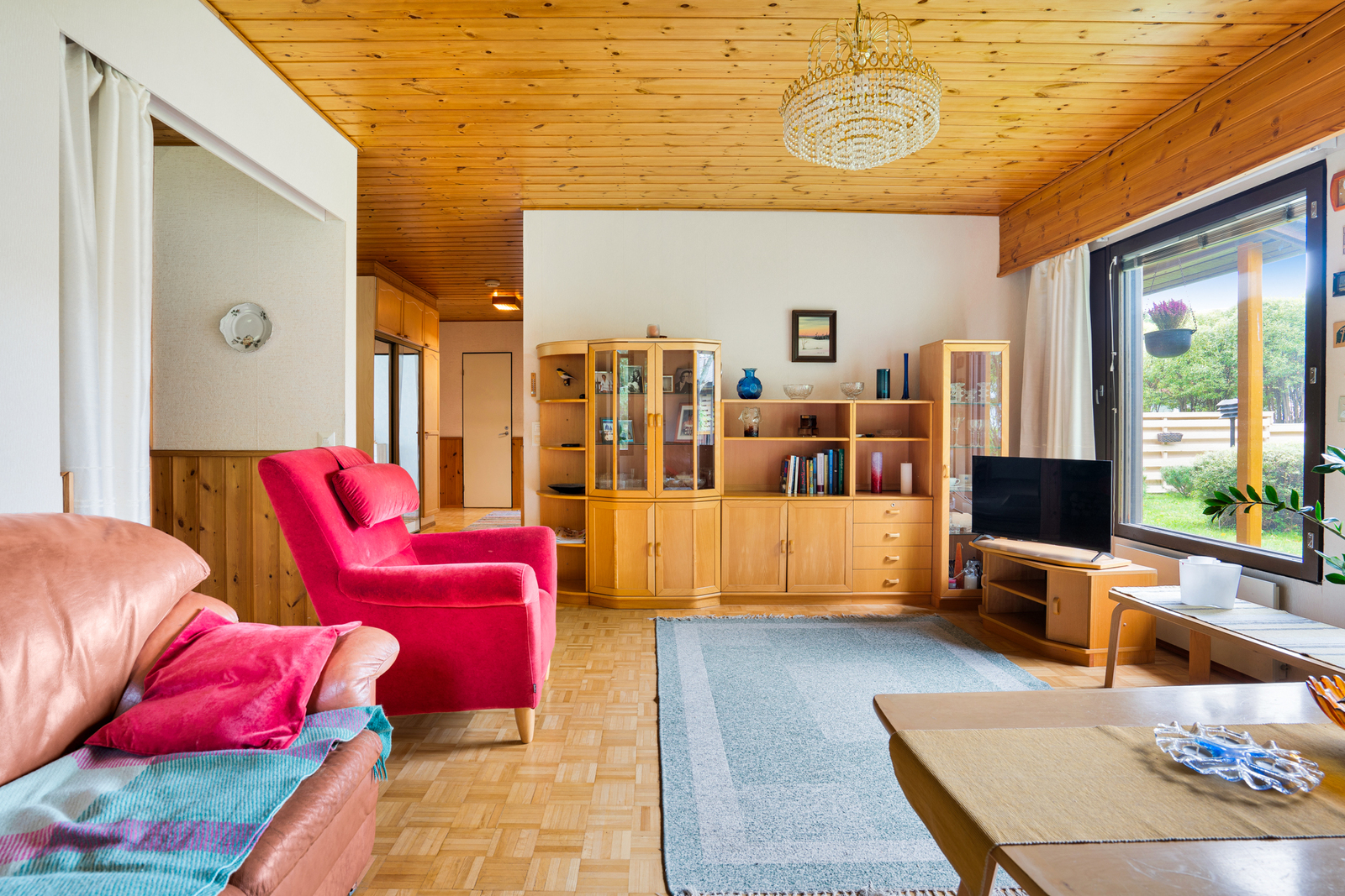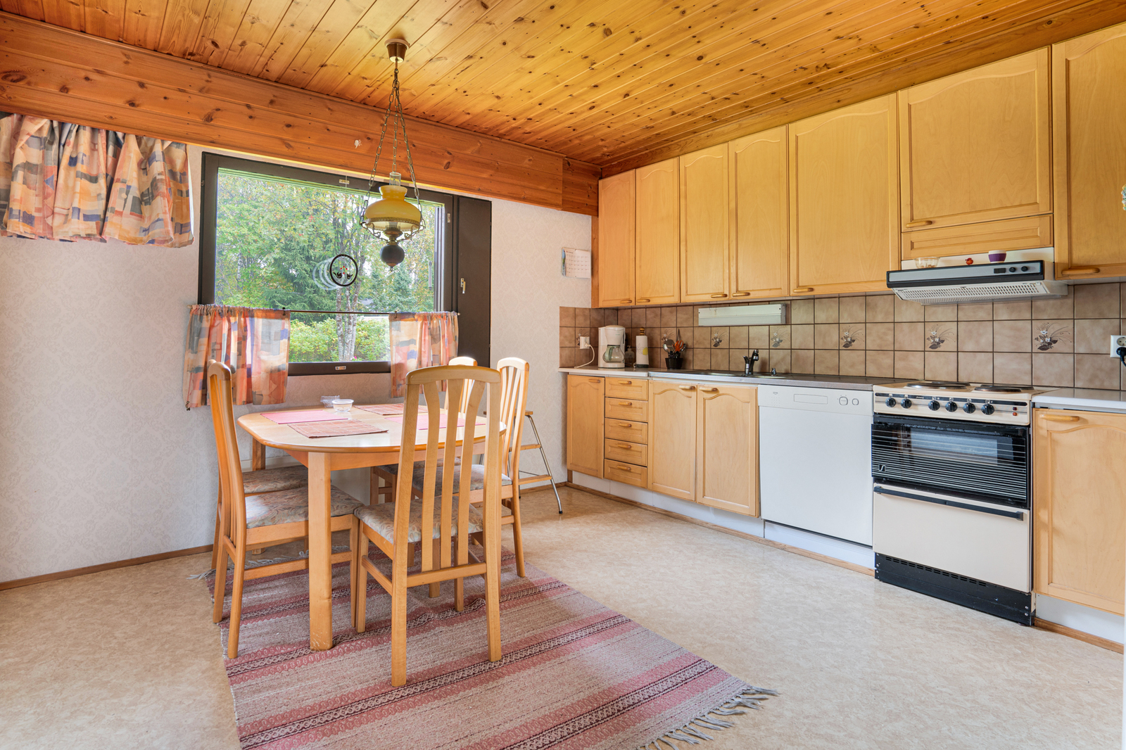 Olohuone on valoisa ja sen jatkeena on takkahuone, jossa tulisija tuo lämpöä ja viihtyisyyttä. Kylpyhuoneessa on lattialämmitys ja pesukoneliitäntä, ja oma sauna kutsuu rentoutumaan puukiukaan lempeisiin löylyihin.