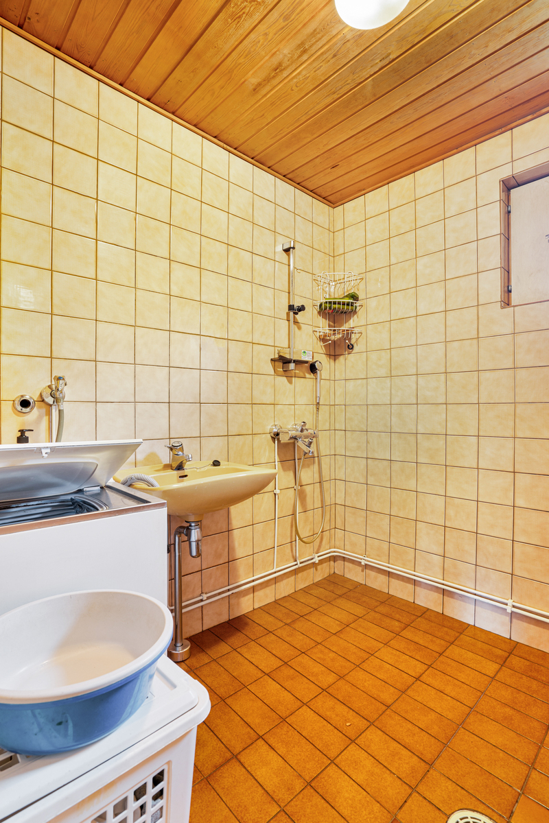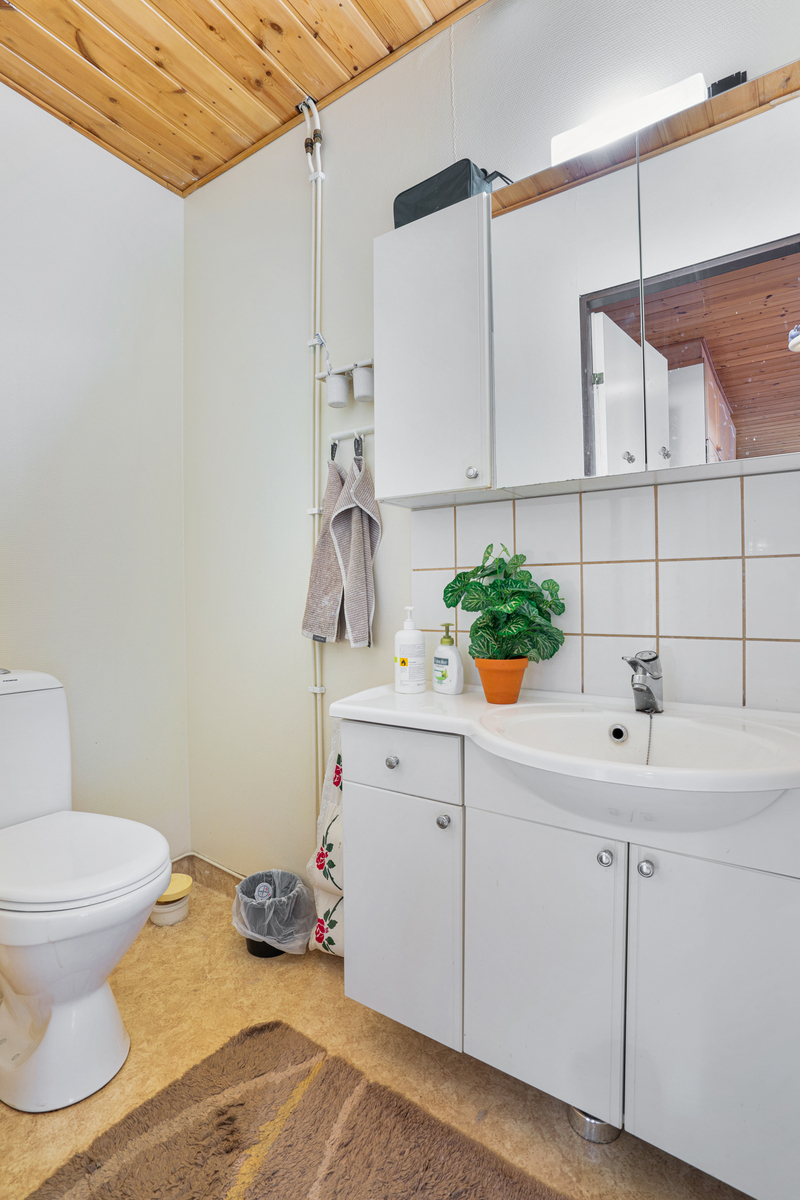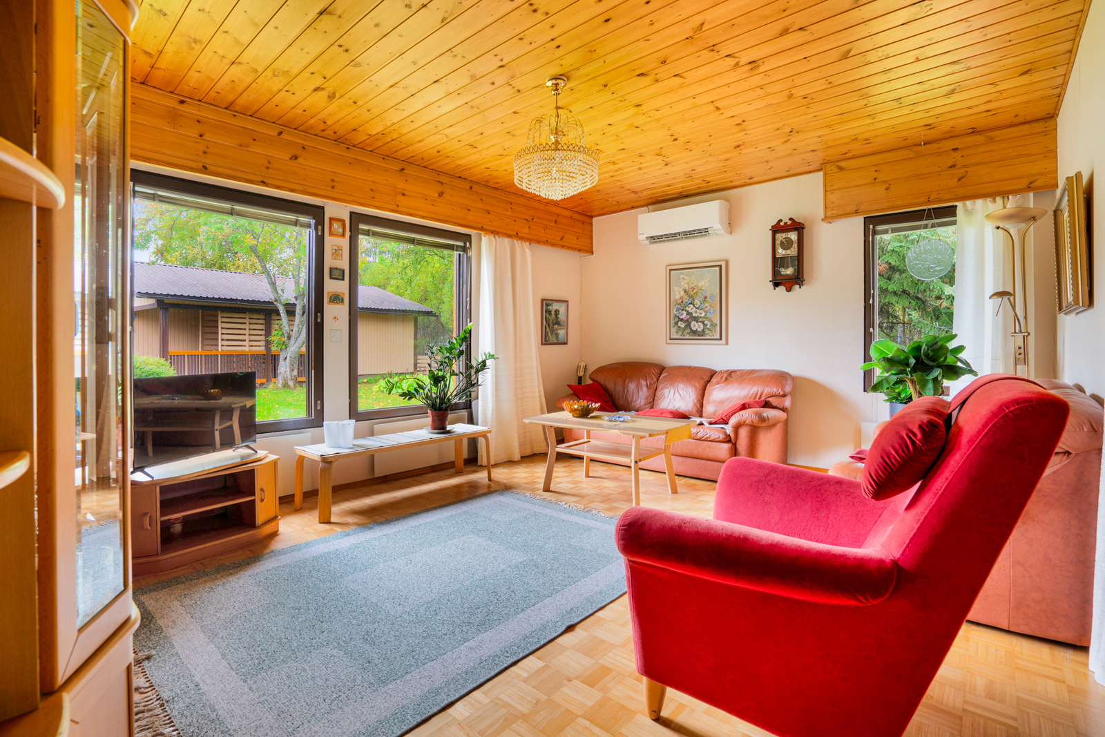 Olohuone on valoisa ja sen jatkeena on takkahuone, jossa tulisija tuo lämpöä ja viihtyisyyttä. Kylpyhuoneessa on lattialämmitys ja pesukoneliitäntä, ja oma sauna kutsuu rentoutumaan puukiukaan lempeisiin löylyihin.