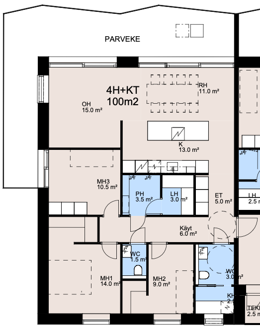 Huoneistojen suunnittelussa on panostettu toimiviin pohjaratkaisuihin ja korkeaan laatuun. Huonekorkeus on noin 2,9 metriä (poislukien alaslasketut kattopinnat), mikä lisää ennestään tilan tuntua. Keittiöissä integroidut kodinkoneet sulautuvat tyylikkäästi kalusteisiin, ja kolmioita suuremmissa huoneistoissa erillisuuni sekä liesitaso sijoitettu saarekkeeseen. Lattiat ovat parkettia ja seinäpinnat maalatut. Ostajilla on mahdollisuus vaikuttaa pintamateriaaleihin sisustusarkkitehdin avustuksella, ja markkinoinnin alkuvaiheessa myös pohjaratkaisuihin voidaan tehdä muutoksia.